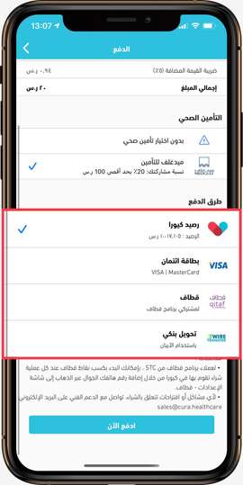 توفر كيورا عدة طرق للدفع منها عبر بطاقات الائتمان الفيزا الماستركارد أو بطاقات مدى المفعلة للشراء عبر الانترنت أو من خلال التحويل البنكي.
